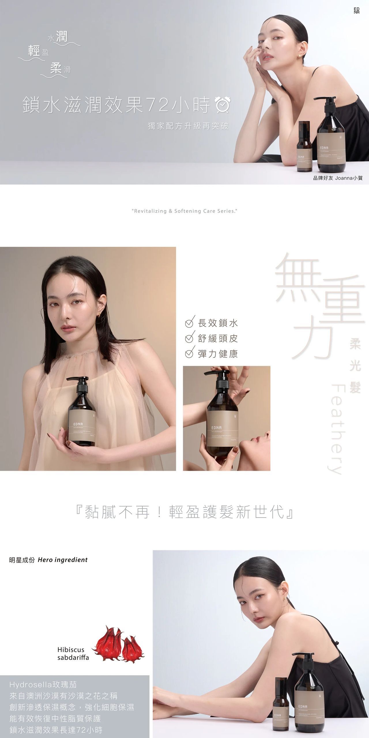 Hydrosella玫瑰茄,有沙漠之花之稱。滲透保濕概念,強化細胞保濕,能有效恢復中性脂質保護,鎖水滋潤效果長達72小時。有機蠟菊萃取,深入滲透到頭皮和髮根,為毛囊提供充足的營養,使髮絲強韌有彈性,減少斷裂和分叉。蜂王漿,擁有極高營養價值,包括多種維生素、礦物質和蛋白質,能形成保護膜,鎖住水分。