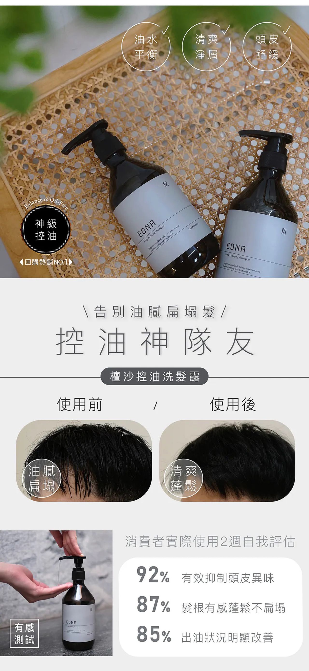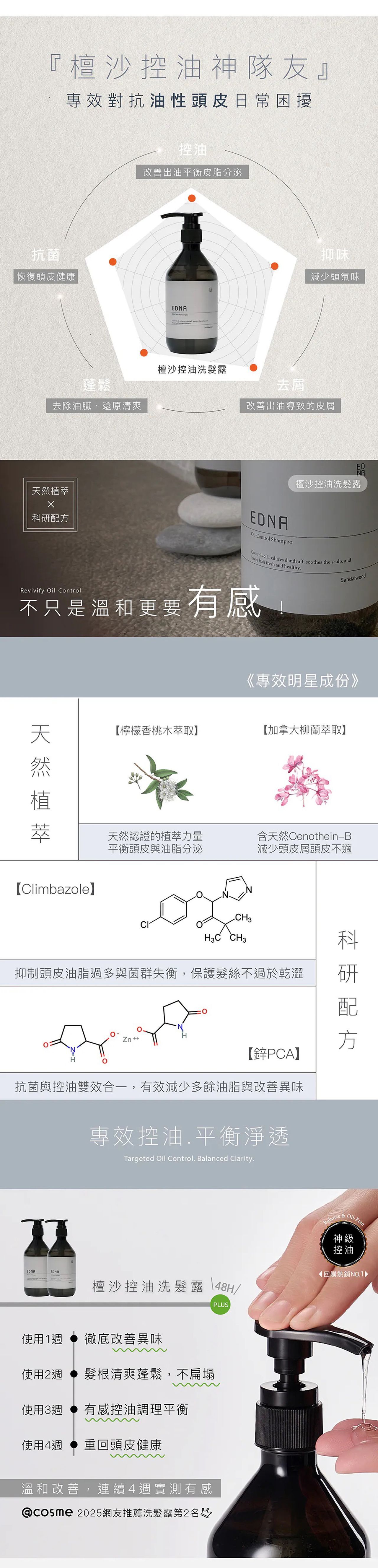添加 Climbazole 有效抗菌並改善頭皮屑困擾。天然認證檸檬香桃木萃取,平衡皮脂減少出油。鋅PCA 控油抗菌,改善頭皮異味。加拿大柳蘭萃取有效舒緩頭皮,減少頭皮屑與不適。